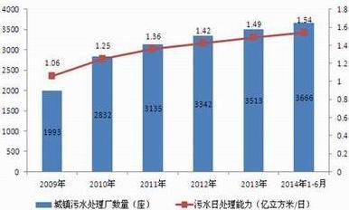圖表1:2009-2014年城鎮(zhèn)污水處理市場容量增長情況(單位:座,億立方米/日)