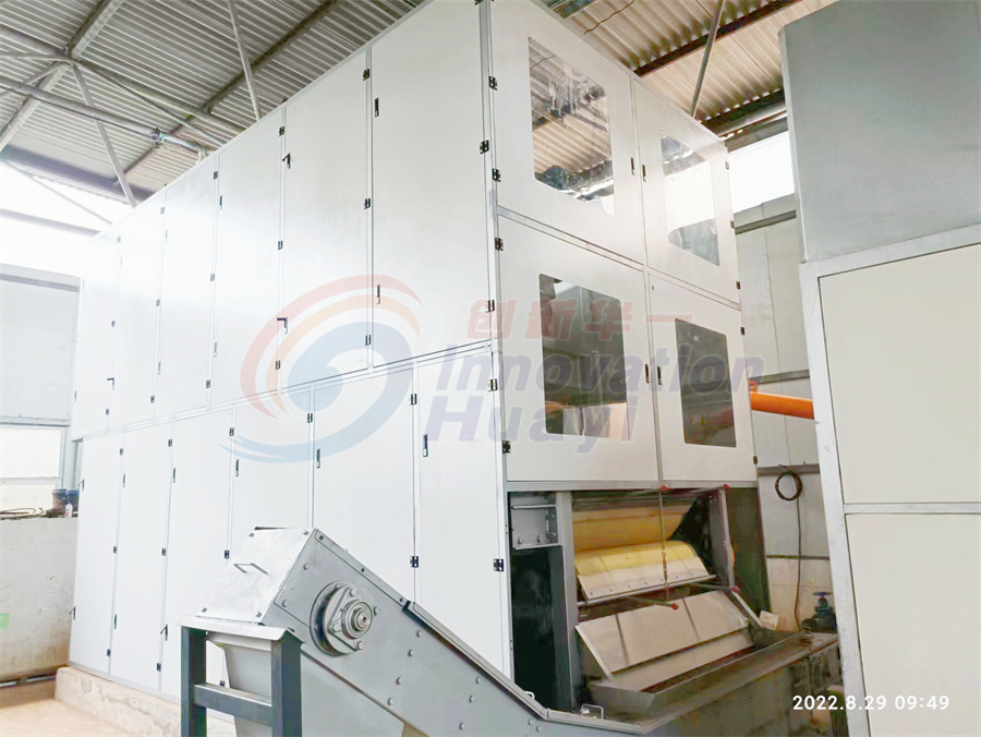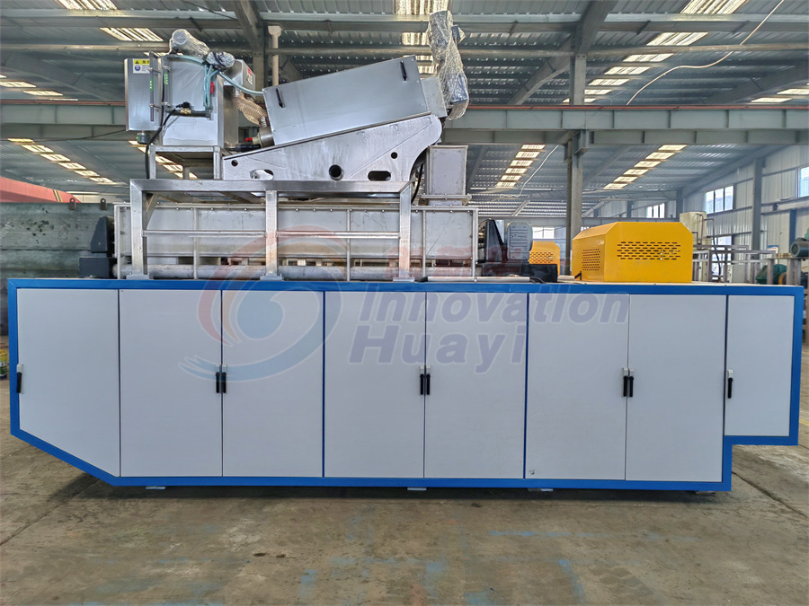一體式高壓帶式污泥脫水機(jī),可直接處理含水率98%的市政污泥,該設(shè)備濃縮段采用疊螺脫水機(jī),處理后污泥含水率85%左右進(jìn)入雙螺旋混合器,污泥和破壁劑在雙螺旋混合器內(nèi)充分混合后進(jìn)入2級(jí)污泥布料器,經(jīng)過(guò)14根呈S型分布的高壓擠壓輥處理后,污泥含水率可以降至70%以下,也可通過(guò)添加少量石灰將含水率降至60%以下。