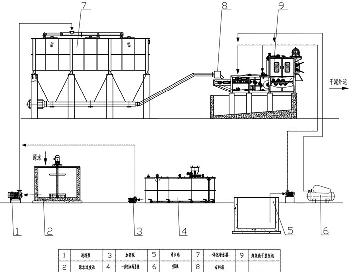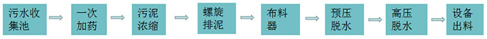 濃度5-10%洗沙污水進(jìn)入收集池經(jīng)過(guò)一次加藥,進(jìn)入一體化凈水器進(jìn)行污泥濃縮,上清液進(jìn)入清水池,濃縮后的污泥經(jīng)過(guò)凈水器底部的螺旋排泥系統(tǒng)進(jìn)入超效高干擠壓機(jī)布料器(無(wú)需二次加藥),均勻布料后進(jìn)入擠壓機(jī)預(yù)壓脫水區(qū),經(jīng)過(guò)多道S型壓榨后,污泥進(jìn)入高壓脫水區(qū),出料含水率可達(dá)25-30%。