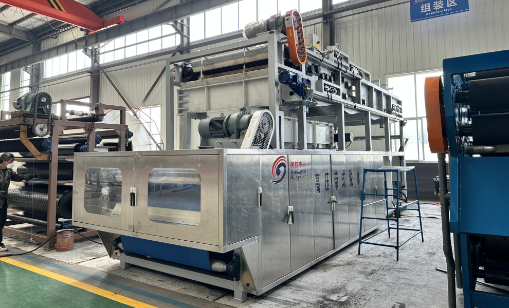 該設(shè)備是我公司在傳統(tǒng)帶式壓濾機基礎(chǔ)上,研發(fā)生產(chǎn)的全新一代污泥深度脫水機。設(shè)備增加了液壓裝置、污泥布料裝置,優(yōu)化了調(diào)偏裝置、沖洗裝置和軸承座。新型超高壓帶式污泥脫水機脫水能力更強,可以在不添加或者少添加輔料的情況下,將污泥含水率降至60%以下。