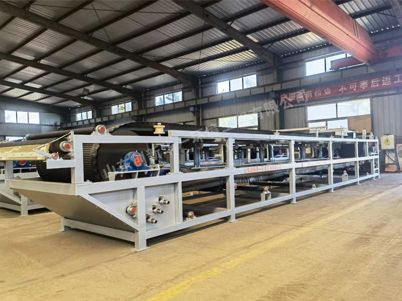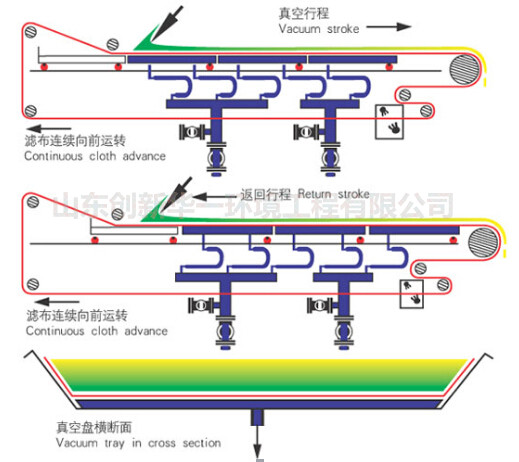 以濾布為過(guò)濾介質(zhì),采用整體的環(huán)形橡膠帶作為真空室。環(huán)形橡膠帶由傳動(dòng)裝置傳動(dòng)做直線運(yùn)行,通過(guò)密封系統(tǒng)實(shí)現(xiàn)料漿的固液分離。當(dāng)真空系統(tǒng)介入時(shí),固體被載流在濾帶上通過(guò)刮刀卸除,液體被自動(dòng)排液罐接收并通過(guò)水封裝置或切換裝置排出,濾布經(jīng)過(guò)高壓沖洗液在線連續(xù)清洗獲得再生。實(shí)現(xiàn)物料從進(jìn)料、脫水、順逆流洗滌、卸渣、濾液排放、濾布清洗和糾偏不間斷的連續(xù)進(jìn)行。