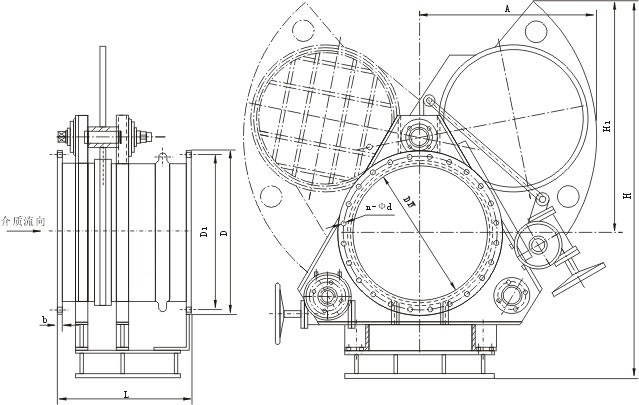 F343CX蝸輪扇形眼鏡閥又稱蝸輪扇形盲板閥,蝸輪翻板閥,蝸輪扇形閥,由左閥體、中閥體、右閥體、扇形盲板、絲桿螺母、不銹鋼補(bǔ)償器、兩個(gè)蝸輪傳動(dòng)機(jī)構(gòu)等組成。它是通過(guò)三根絲桿連成一體,并把三個(gè)閥體分別固定在底座上,構(gòu)成一個(gè)剛性結(jié)構(gòu)體。中閥體與右閥體用不銹鋼膨脹管連接,左、中閥體分別用三根兩端帶左右梯形螺紋的絲桿連接,將三根絲桿同時(shí)作正向(或反向)旋轉(zhuǎn),則左、中兩閥體得到壓緊(或分離)。三根絲桿中上面一根絲杠中間裝有盲板,盲板繞該軸心旋轉(zhuǎn)。下面兩根絲桿在同樣的部位上安裝有盲板的定位塊,盲板旋轉(zhuǎn)時(shí)可以防止盲板漂移,避免密封圈擦傷,其中一根絲桿上裝有蝸輪傳動(dòng)機(jī)構(gòu),實(shí)現(xiàn)松開(kāi)夾緊閥體的目的。